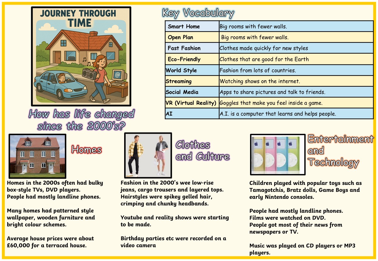 This term, our learning will take us on an exciting journey through the past two decades as we explore how life has changed since the early 2000s. We will investigate three fascinating themes: